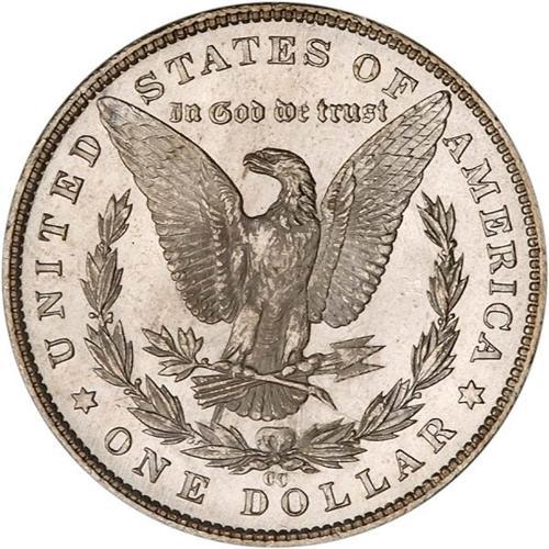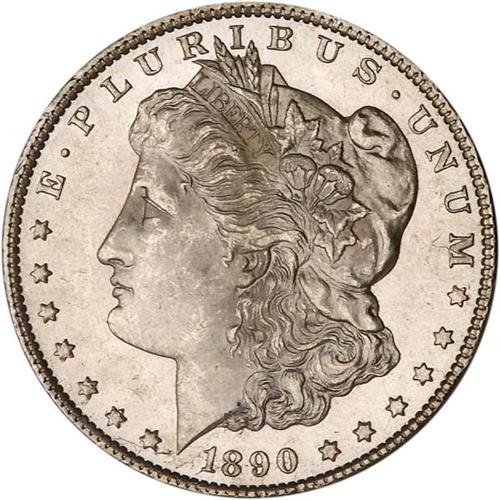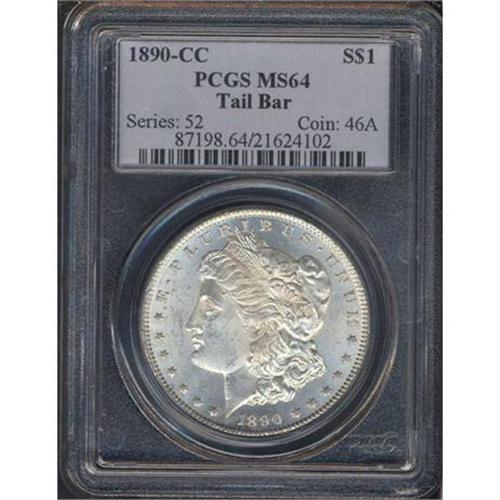 <b>1890-CC Morgan Dollar. Tail bar. PCGS graded MS64.</b> A few tiny bagmarks on the cheek, otherwise, sleek white in color with plenty of frost topping all devices. VAM-4. Top 100 Variety. The popular yet curious 'Tail Bar' variety was likely caused by the slip of an engraver's tool, causing a raised line from the end of the eagle's tail to the leaf below <b>(PCGS # 87198)</b>