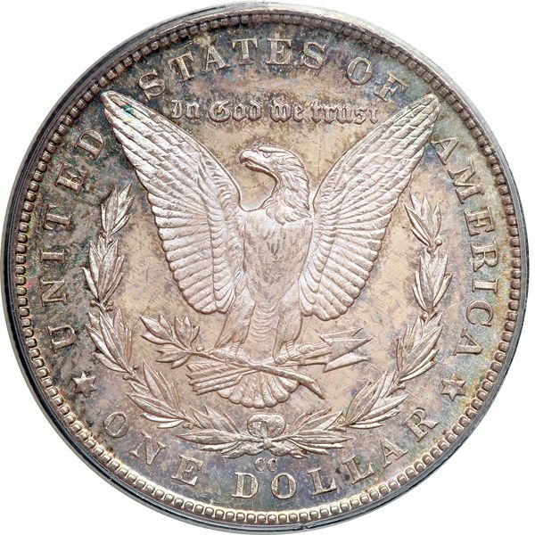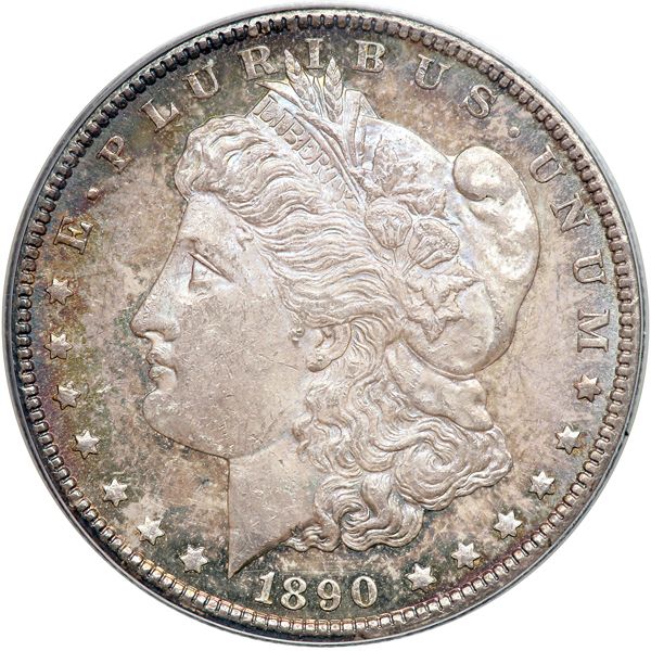 1890-CC Morgan Dollar. PCGS graded MS-62 Prooflike PQ CAC Approved. Well struck with lovely blue and golden toning (PCGS # 7199) .