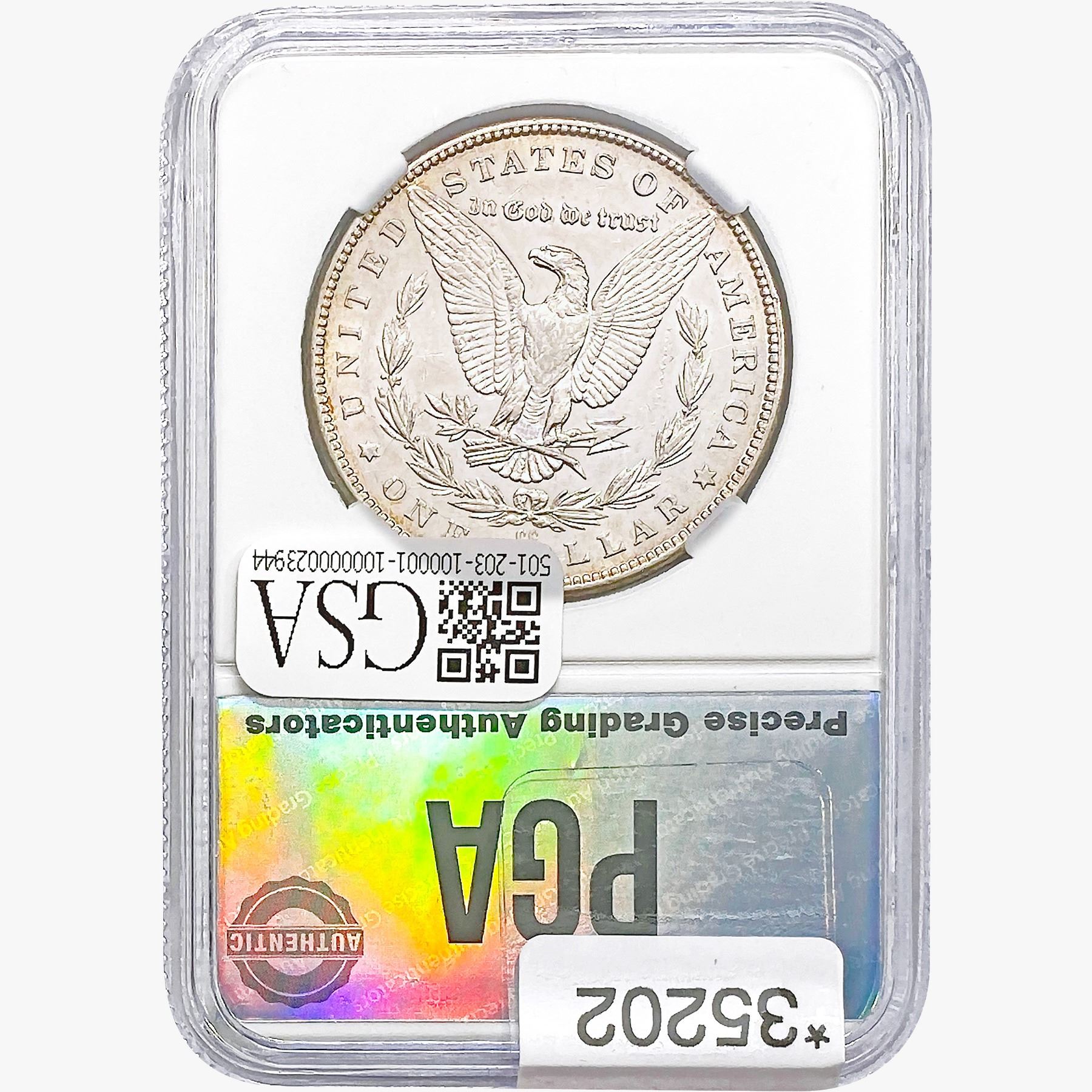 COINS AND CURRENCY LISTED IN GSA’S CATALOG AS GRADED AND ENCAPSULATED BY PCGS, NGC, ANACS, ICG, PCGS CURRENCY, PMG, PCGS BANKNOTE GRADING, CMC OR ANY OTHER THIRD-PARTY GRADING SERVICE ARE LIKEWISE SOLD “AS-IS” EXCEPT AS EXPRESSLY SET FORTH HEREIN. ALL THIRD-PARTY GRADING SERVICE GUARANTEES, INCLUDING AUTHENTICITY, ARE THE SOLE RESPONSIBILITY OF THE THIRD-PARTY GRADING SERVICE AND NOT WARRANTIES OR GUARANTEES OF GSA. BIDDERS SHOULD CONTACT THESE THIRD-PARTY GRADING SERVICES DIRECTLY WITH RESPECT TO ANY CLAIMS OR QUESTIONS THEY MAY HAVE CONCERNING THEIR GUARANTEES AND WARRANTIES. BIDDERS ACKNOWLEDGE AND AGREE THAT AUCTIONEER IS NOT BOUND BY OR LIABLE FOR ANY OPINION OR CERTIFICATION BY ANY THIRD-PARTY GRADING SERVICE. REMOVAL OF A PRODUCT FROM ITS PROTECTIVE CASING OR HOLDER OR ALTERATION OF ANY COIN HOLDER WAIVES ALL RIGHTS CONCERNING THE PRODUCT CONTAINED THEREIN.