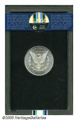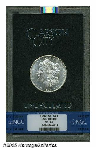 <B>1890-CC<S$1> GSA Dollar MS62 NGC.</B></I> Rarely encountered in a GSA holder, this and the 1891-CC below will surely be of interest to collectors of this highly collectible subset of Morgan dollars that were held in government vaults for 80 or so years. Brilliant throughout with numerous small abrasions on the cheek of Liberty that account for the grade. The original box and insert are also included.