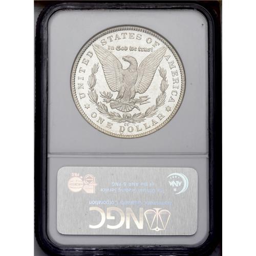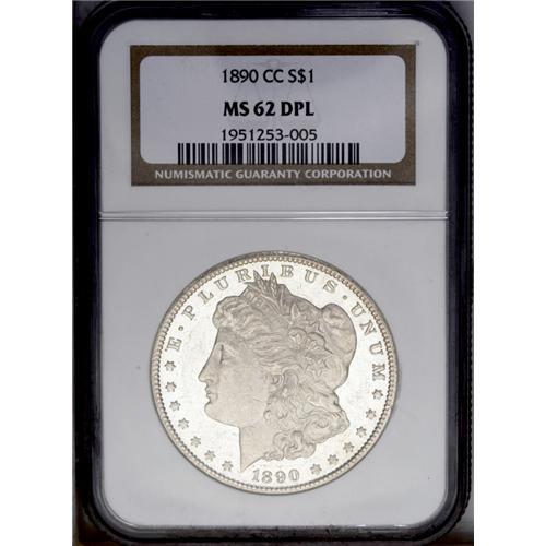 <B>1890-CC<img border='0' src='http://www.heritagecoins.com/images/star.gif' width=10 height=10>$1> MS62 Deep Mirror Prooflike NGC.</B></I> Heavily frosted motifs appear to float over deep, watery fields. The design elements are sharply impressed throughout. Several miniscule marks, especially on the obverse, limit the grade. <BR><BR><B>Important notice:</B> Heritage usually auctions material at the rate of 200-250 lots per hour. On some occasions eBay Live bid software or the Internet may not be able to keep up with the pace of the auction. We recommend placing a realistic absentee bid now as insurance to avoid disappointment. Occasionally the auctioneer may eliminate or reject an eBay Live bid, and the auctioneer may also reopen a lot after the close of the eBay live bidding (usually because we missed an audience bid), and may reject your bid even if it shows you as the winning bidder. By bidding via eBay Live, you agree that Heritage may award the lot to another bidder at its sole discretion under the circumstances described above or any other reasonable circumstances. Since eBay bids are not shown to us until we open the lot on the floor, we treat those bids just like floor bids. In most cases the floor responds before the eBay bid is presented to us, due to Internet lag time, so for consistency we have made it a policy that floor bids are always considered first over tie eBay live bids. Also please note that all Heritage lots purchased through eBay Live carry a 20% Buyer's Premium. Please make sure you read the Terms and Conditions before you bid. This lot is being auctioned in conjunction with a live floor auction by Heritage Galleries & Auctioneers. All final auction and invoice information will be supplied by Heritage Galleries & Auctioneers, and all other information should be considered preliminary. Lot:3549 <BR><BR><B>Winning Notification and Billing:</B> After the FINAL session in this auction is complete, Heritage will send e-mail and snail mail invoices. This process normally takes several days. All final auction and invoice information will be supplied by Heritage Galleries & Auctioneers, and all other information should be considered preliminary. <BR><BR>This auction will be conducted on a live auction floor and over the Internet through eBay Live. If you choose to place an absentee bid, please take a moment to <font color='#0000ff'><u><a href='http://pages.ebay.com/liveauctions/help/before/laabsentee.html'>learn how eBay Live absentee bidding works</a></u></font><font color='#000000'>