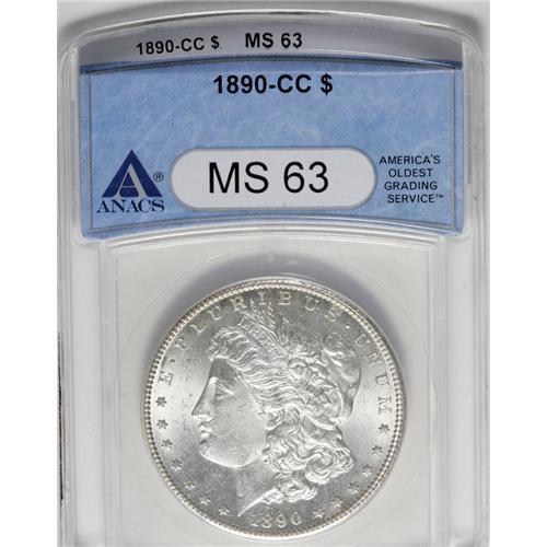 <B>1890-CC S$1 MS63 ANACS.</B></I> A lustrous and nicely struck example, including partial definition in the hair above Liberty's ear, with faint hints of toning along portions of the reverse rim. Some contact marks on the cheek and the eagle's breast contribute to the grade.<BR><BR><b>Shipping:</b> Coin/Currency (<a target="_blank" href="http://www.heritageauctions.com/common/shipping.php">view shipping information</a>)