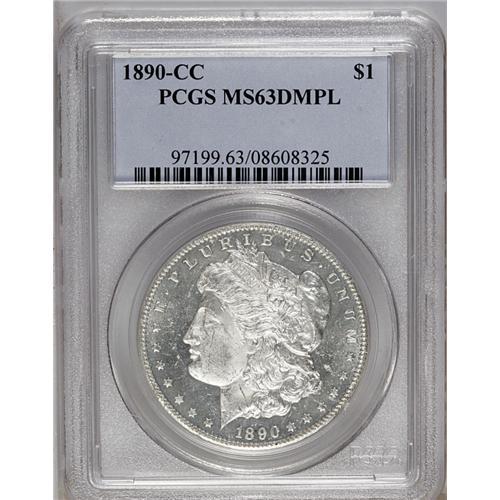 <B>1890-CC<img border='0' src='http://www.heritagecoins.com/images/star.gif' width=10 height=10>$1> MS63 Deep Mirror Prooflike PCGS.</B></I> Intense and flashy with excellent contrast between the untoned fields and the heavily frosted devices. Scattered marks on both sides limit the grade.