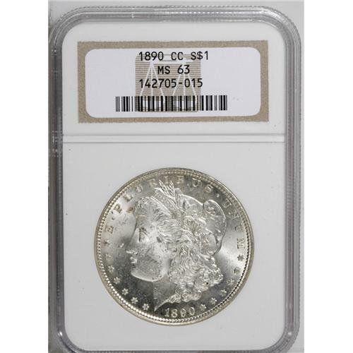 <B>1890-CC<img border='0' src='http://www.heritagecoins.com/images/star.gif' width=10 height=10>$1> MS63 NGC.</B></I> Essentially brilliant with a small spot of red near Liberty's brow, a strip of ice-blue near the headband, and a tiny dark spot on either side. Lustrous and well struck with marks appropriate for the grade.