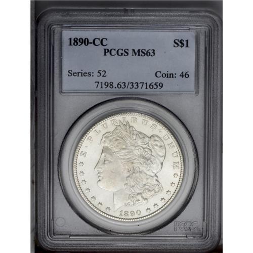 <B>1890-CC<img border='0' src='http://www.heritagecoins.com/images/star.gif' width=10 height=10>$1> MS63 PCGS.</B></I> A lustrous and suitably struck better date CC-mint dollar. Relatively clean for the grade, although faint mint-made roller marks are noted near the chin and a small planchet flaw, also of mint origin, resides on the cheek. Both C's in the mintmark are repunched. <BR><BR><B>Important notice:</B> Heritage usually auctions material at the rate of 200-250 lots per hour. On some occasions eBay Live bid software or the Internet may not be able to keep up with the pace of the auction. We recommend placing a realistic absentee bid now as insurance to avoid disappointment. Occasionally the auctioneer may eliminate or reject an eBay Live bid, and the auctioneer may also reopen a lot after the close of the eBay live bidding (usually because we missed an audience bid), and may reject your bid even if it shows you as the winning bidder. By bidding via eBay Live, you agree that Heritage may award the lot to another bidder at its sole discretion under the circumstances described above or any other reasonable circumstances. Since eBay bids are not shown to us until we open the lot on the floor, we treat those bids just like floor bids. In most cases the floor responds before the eBay bid is presented to us, due to Internet lag time, so for consistency we have made it a policy that floor bids are always considered first over tie eBay live bids. Also please note that all Heritage lots purchased through eBay Live carry a 20% Buyer's Premium. Please make sure you read the Terms and Conditions before you bid. This lot is being auctioned in conjunction with a live floor auction by Heritage Galleries & Auctioneers. All final auction and invoice information will be supplied by Heritage Galleries & Auctioneers, and all other information should be considered preliminary. Lot:3538 <BR><BR><B>Winning Notification and Billing:</B> After the FINAL session in this auction is complete, Heritage will send e-mail and snail mail invoices. This process normally takes several days. All final auction and invoice information will be supplied by Heritage Galleries & Auctioneers, and all other information should be considered preliminary. <BR><BR>This auction will be conducted on a live auction floor and over the Internet through eBay Live. If you choose to place an absentee bid, please take a moment to <font color='#0000ff'><u><a href='http://pages.ebay.com/liveauctions/help/before/laabsentee.html'>learn how eBay Live absentee bidding works</a></u></font><font color='#000000'>