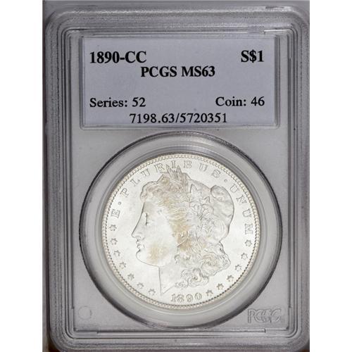 <B>1890-CC<img border='0' src='http://www.heritagecoins.com/images/star.gif' width=10 height=10>$1 MS63 PCGS.</B></I> A wisp or two of tan color appears on the Liberty and eagle motifs. Some weakness is noted in the centers, otherwise the design elements are well impressed. The minor luster grazes on Liberty's cheek and in the left (facing) obverse field are fewer than what might be expected for the grade.