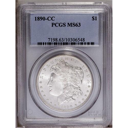 <B>1890-CC<img border='0' src='http://www.heritagecoins.com/images/star.gif' width=10 height=10>$1> MS63 PCGS.</B></I> Brilliant with swirling cartwheel luster, removed from a higher grade by a couple of abrasions on the cheek and chin. Decently struck, if not fully so. <BR><BR><B>Important notice:</B> Heritage usually auctions material at the rate of 200-250 lots per hour. On some occasions eBay Live bid software or the Internet may not be able to keep up with the pace of the auction. We recommend placing a realistic absentee bid now as insurance to avoid disappointment. Occasionally the auctioneer may eliminate or reject an eBay Live bid, and the auctioneer may also reopen a lot after the close of the eBay live bidding (usually because we missed an audience bid), and may reject your bid even if it shows you as the winning bidder. By bidding via eBay Live, you agree that Heritage may award the lot to another bidder at its sole discretion under the circumstances described above or any other reasonable circumstances. Since eBay bids are not shown to us until we open the lot on the floor, we treat those bids just like floor bids. In most cases the floor responds before the eBay bid is presented to us, due to Internet lag time, so for consistency we have made it a policy that floor bids are always considered first over tie eBay live bids. Also please note that all Heritage lots purchased through eBay Live carry a 20% Buyer's Premium. Please make sure you read the Terms and Conditions before you bid. This lot is being auctioned in conjunction with a live floor auction by Heritage Galleries & Auctioneers. All final auction and invoice information will be supplied by Heritage Galleries & Auctioneers, and all other information should be considered preliminary. Lot:3537 <BR><BR><B>Winning Notification and Billing:</B> After the FINAL session in this auction is complete, Heritage will send e-mail and snail mail invoices. This process normally takes several days. All final auction and invoice information will be supplied by Heritage Galleries & Auctioneers, and all other information should be considered preliminary. <BR><BR>This auction will be conducted on a live auction floor and over the Internet through eBay Live. If you choose to place an absentee bid, please take a moment to <font color='#0000ff'><u><a href='http://pages.ebay.com/liveauctions/help/before/laabsentee.html'>learn how eBay Live absentee bidding works</a></u></font><font color='#000000'>