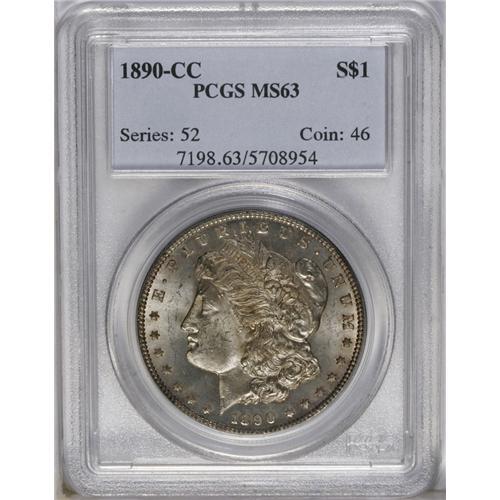<B>1890-CC<img border='0' src='http://www.heritagecoins.com/images/star.gif' width=10 height=10>$1> MS63 PCGS.</B></I> Lustrous with hints of ice blue toning. Slight weakness on the hair is not a factor in the grade. Abrasions are appropriate for a Select designation.
