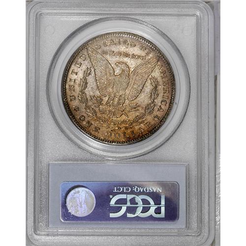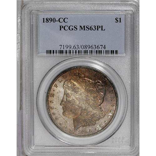 <B>1890-CC<img border='0' src='http://www.heritagecoins.com/images/star.gif' width=10 height=10>$1> MS63 Prooflike PCGS.</B></I> Thin gold and red-violet patina covers the highly reflective surfaces. Nicely struck with the scattered abrasions one would expect of a Select Morgan dollar.