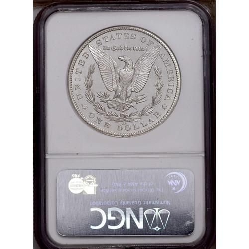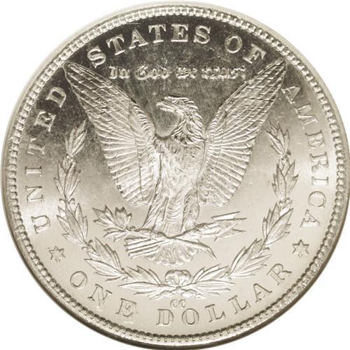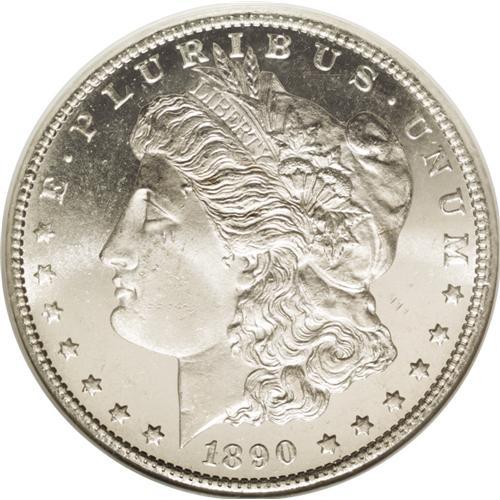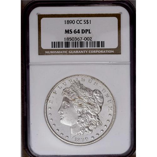 <B>1890-CC<img border='0' src='http://www.heritagecoins.com/images/star.gif' width=10 height=10>$1> MS64 Deep Mirror Prooflike NGC.</B></I> This pinpoint-sharp near-Gem delivers impressive contrast between the icy devices and the flashy mirrored fields. A hint of gold toning is found within Liberty's hair, but the clean surfaces are otherwise brilliant.