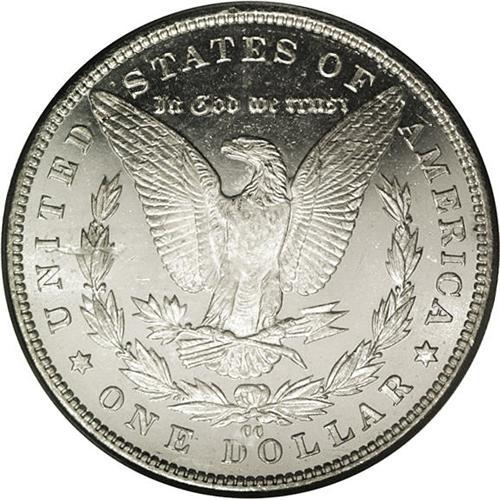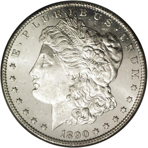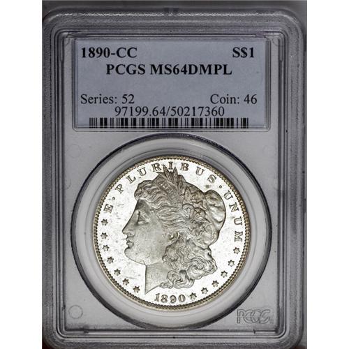 <B>1890-CC<img border='0' src='http://www.heritagecoins.com/images/star.gif' width=10 height=10>$1> MS64 Deep Mirror Prooflike PCGS.</B></I> A bright, totally untoned coin with nicely mirrored surfaces and moderately cameoed devices. The fields are particularly watery and deep, their reflectivity challenging that of an actual proof. A number of contact marks are mentioned on Liberty's cheek that combine to limit the grade. Only 19 finer DMPL examples have been certified by PCGS (4/06).