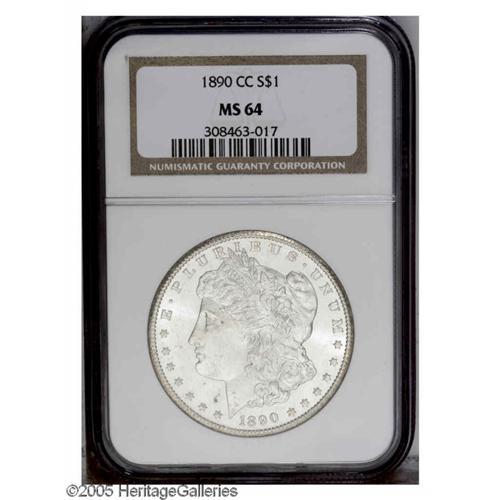 <B>1890-CC<S$1> MS64 NGC.</B></I> Booming luster dominates this decisively struck better date CC-mint Dollar. Dollops of golden color are most noticeable on the lower obverse. The reverse is nearly unabraded, and the obverse is relatively clean.