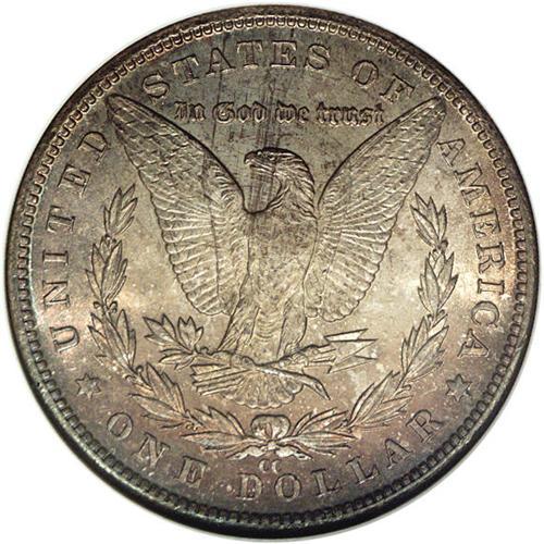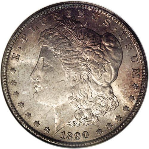 <B>1890-CC<img border='0' src='http://www.heritagecoins.com/images/star.gif' width=10 height=10>$1> MS64 NGC.</B></I> This is a heavily toned example with argent-gray color accented by violet, lilac, sunset and iridescent toning in a somewhat variegated fashion on both sides. The underlying surfaces have frosty silver luster. The attractive colorations will be found quite desirable, and should substantially increase the price realized over similarly graded brilliant white examples of this issue.<BR><I>From The Lewis (Tahoe) Collection.</B></I>