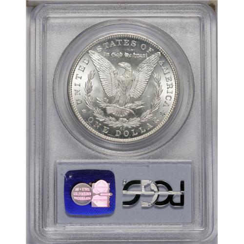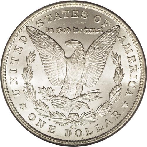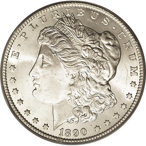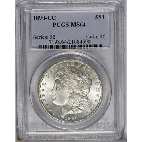 <B>1890-CC<img border='0' src='http://www.heritagecoins.com/images/star.gif' width=10 height=10>$1> MS64 PCGS.</B></I> A lustrous and boldly struck near-Gem, with the reverse even nicer than the obverse (as is so often the case). This CC favorite is essentially white with only the slightest hint of natural patina. The cheek displays several light contact marks, which we suspect restrict this coin from the MS65 category.<BR><I>From The Chicago-Ark Collection.</B></I>