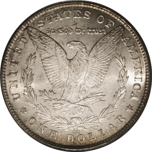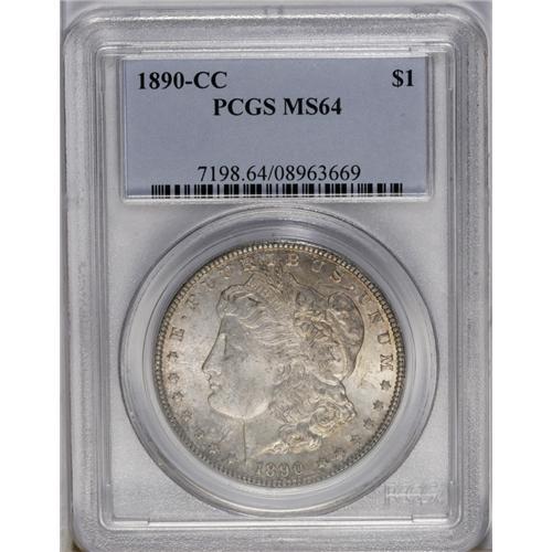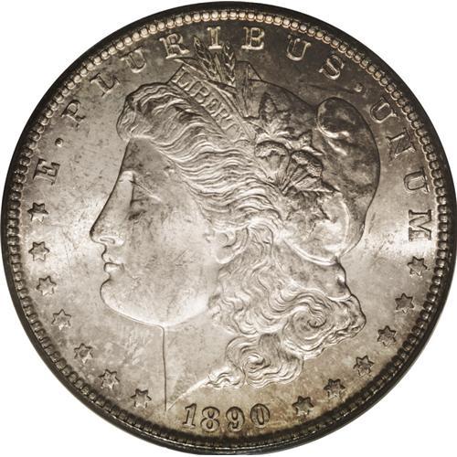 <B>1890-CC<img border='0' src='http://www.heritagecoins.com/images/star.gif' width=10 height=10>$1> MS64 PCGS.</B></I> Blended golden-brown and dove-gray toning graces this lustrous and intricately struck better date Carson City dollar. The reverse is remarkably void of marks, and the obverse is also clean despite a few unimportant blemishes on the cheek. The 1890-CC has more than ten times the mintage of the 1885-CC, but is much scarcer in Mint State.