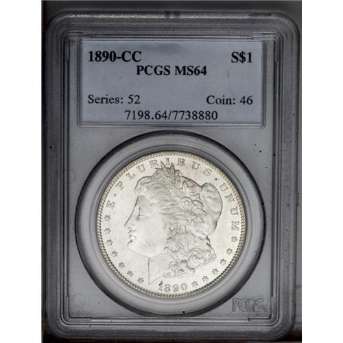 <B>1890-CC<img border='0' src='http://www.heritagecoins.com/images/star.gif' width=10 height=10>$1> MS64 PCGS.</B></I> Fully brilliant luster on both sides enhances the sharp strike of this near-Gem Morgan silver dollar. Both sides have frosty white surfaces. An excellent example for the Morgan dollar collector, or the Carson City Mint specialist. <BR><BR><B>Important notice:</B> Heritage usually auctions material at the rate of 200-250 lots per hour. On some occasions eBay Live bid software or the Internet may not be able to keep up with the pace of the auction. We recommend placing a realistic absentee bid now as insurance to avoid disappointment. Occasionally the auctioneer may eliminate or reject an eBay Live bid, and the auctioneer may also reopen a lot after the close of the eBay live bidding (usually because we missed an audience bid), and may reject your bid even if it shows you as the winning bidder. By bidding via eBay Live, you agree that Heritage may award the lot to another bidder at its sole discretion under the circumstances described above or any other reasonable circumstances. Since eBay bids are not shown to us until we open the lot on the floor, we treat those bids just like floor bids. In most cases the floor responds before the eBay bid is presented to us, due to Internet lag time, so for consistency we have made it a policy that floor bids are always considered first over tie eBay live bids. Also please note that all Heritage lots purchased through eBay Live carry a 20% Buyer's Premium. Please make sure you read the Terms and Conditions before you bid. This lot is being auctioned in conjunction with a live floor auction by Heritage Galleries & Auctioneers. All final auction and invoice information will be supplied by Heritage Galleries & Auctioneers, and all other information should be considered preliminary. Lot:3545 <BR><BR><B>Winning Notification and Billing:</B> After the FINAL session in this auction is complete, Heritage will send e-mail and snail mail invoices. This process normally takes several days. All final auction and invoice information will be supplied by Heritage Galleries & Auctioneers, and all other information should be considered preliminary. <BR><BR>This auction will be conducted on a live auction floor and over the Internet through eBay Live. If you choose to place an absentee bid, please take a moment to <font color='#0000ff'><u><a href='http://pages.ebay.com/liveauctions/help/before/laabsentee.html'>learn how eBay Live absentee bidding works</a></u></font><font color='#000000'>