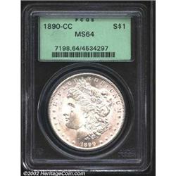 1890-CC S$1 MS64 PCGS. Fully struck with thick, satiny luster that is unaffected by any troublesome abrasions. A very pleasing coin for the grade and suggestive of a Gem. Important notice: We expect to be auctioning lots at the rate of 200-250 per hour. Sometimes eBay Premier live bid software cannot keep up with that pace, so we strongly recommend that you place a realistic proxy bid now as insurance to avoid disappointment. Also please note that all Heritage/CAA lots purchased through eBay Premier carry a 20% Buyer's Premium.