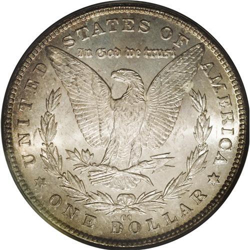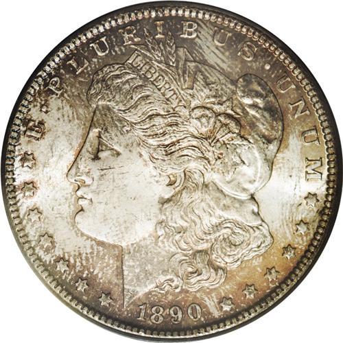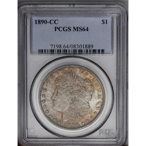 <B>1890-CC<img border='0' src='http://www.heritagecoins.com/images/star.gif' width=10 height=10>$1> MS64 PCGS.</B></I> It is usually only when old-time holdings are sold that coins appear on the market with complete originality. This is one such coin, with surfaces and toning that suggest it is from an old collection, similar to a few other coins in the present sale. Both sides of this near-Gem quality dollar have frosty luster with light ivory color. The obverse is accented by splashes of pale orange and iridescent toning with hints of similar color on the reverse. A few old bagmarks on Liberty's cheek have kept this lovely dollar away from the Gem quality grade level. In today's era of conservation, it is refreshing to see a small selection of original coins, pieces that have not been cleaned or otherwise enhanced.<BR><I>From The Lewis (Tahoe) Collection.</B></I>
