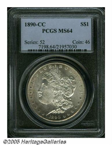 <B>1890-CC<S$1> MS64 PCGS.</B></I> Sharply struck and mostly brilliant with a hint of peripheral color. Only the slightest luster grazes on the obverse prevent a full Gem grade.