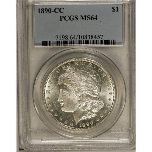 <B>1890-CC S$1 MS64 PCGS.</B></I> Vivid luster radiates from essentially untoned, minimally abraded surfaces. The motifs are nicely impressed throughout. Overall, quite a pleasing near-Gem with great eye appeal.<BR><BR><b>Shipping:</b> Coin/Currency (<a target="_blank" href="http://www.heritageauctions.com/common/shipping.php">view shipping information</a>)