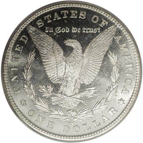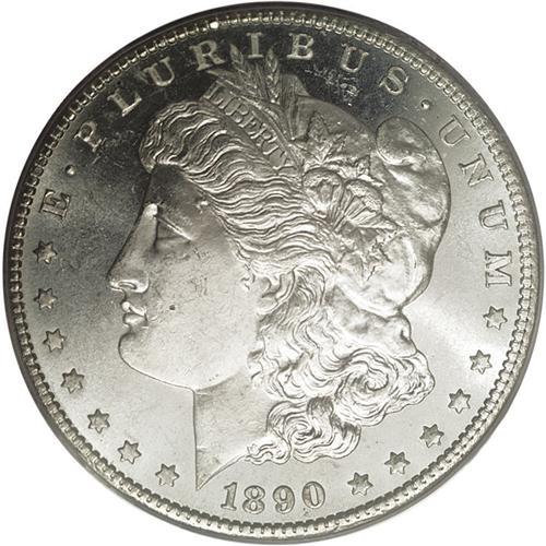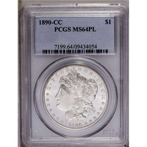 <B>1890-CC<img border='0' src='http://www.heritagecoins.com/images/star.gif' width=10 height=10>$1> MS64 Prooflike PCGS.</B></I> Mint State 1890-CC dollars with prooflike surfaces are relatively scarce, especially in the higher grades. The current near-Gem specimen displays excellent field to device contrast, and is essentially untoned except for a wisp or two of light tan-gold color. Both sides exhibit bright luster. The design features are well brought up, with the hair over Liberty's ear revealing partial definition. The grade is defined by a few minute contact marks and luster grazes on the cheek and in the upper obverse fields. Population: 70 in 64 Prooflike, 10 finer (2/06).