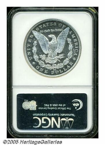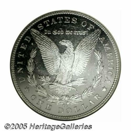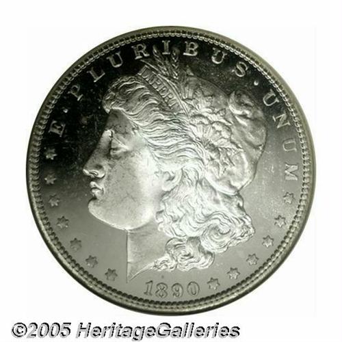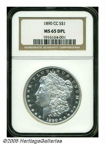 <B>1890-CC<S$1> MS65 Deep Mirror Prooflike NGC.</B></I> While reflective qualities are frequently found on Mint State 1890-CC Dollars, such examples are normally peppered with abrasions of varying severity. Several hundred DMPLs have been certified by NGC alone in the MS62 to MS64 grade range. Once the Gem threshold is reached, however, the number of survivors plummets to single digits. This refreshingly smooth Carson City Dollar is one of the select few. The sparkling, untoned mirrors show only minimal signs of contact and provide ample contrast for the chalk-white devices. An important offering for the DMPL or Carson City specialist. Population: 6 in 65, 0 finer (5/05).