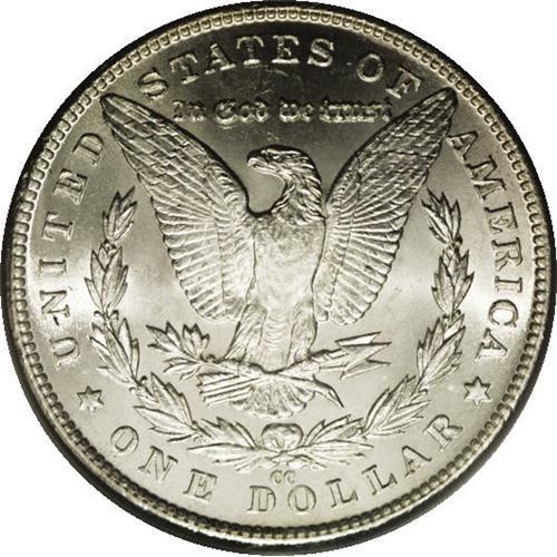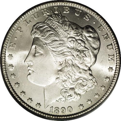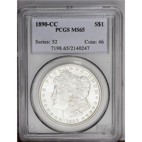 <B>1890-CC<img border='0' src='http://www.heritagecoins.com/images/star.gif' width=10 height=10>$1 MS65 PCGS.</B></I> A very scarce date in full Gem condition, and this coin has excellent eye appeal for a Morgan dollar. Particularly frosty on Liberty's hair and ear, and a small nick is found just below and behind her mouth. Obtaining a Gem example of this date has always been a significant challenge for a date collector, and this is as nice as anyone could hope to obtain. Population: 193 in 65, 8 finer (12/05).