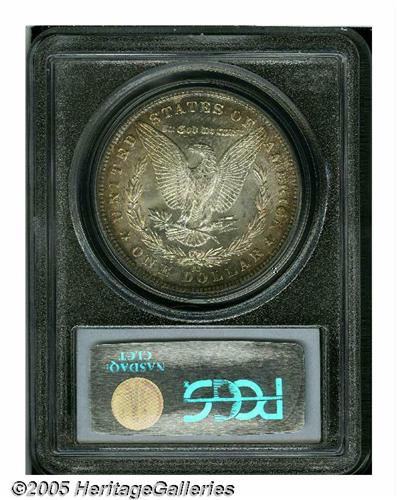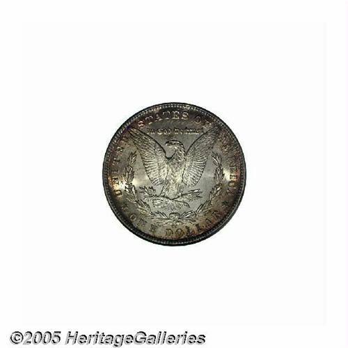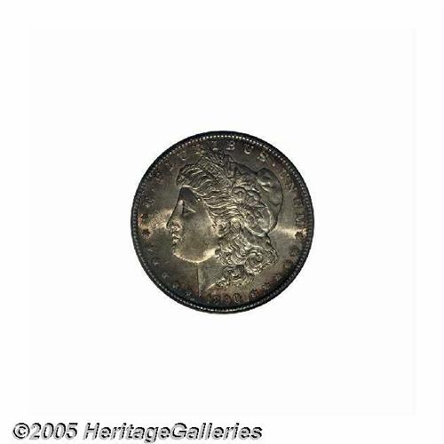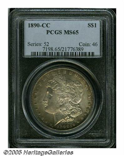 <B>1890-CC<S$1> MS65 PCGS.</B></I> Attractive frosty luster. Virtually all design features show bold definition save for the eagle's talons. The obverse has golden toning at the center deepening to golden-brown at the rim. The reverse is brilliant at the center, with peach toning peripherally. Wisps of electric blue ornament the borders on both the obverse and reverse.