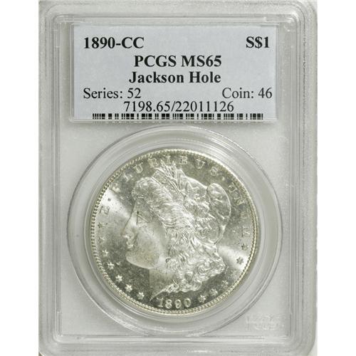 <B>1890-CC S$1 MS65 PCGS.</B></I> Ex: Jackson Hole. Brilliant and well struck, this coin has sufficient reflectivity in the fields to render a cameo effect on both sides. A few wispy die striations and roller marks are noted, along with a faint grease stain on the lower reverse, just above OL in DOLLAR. Surface blemishes are minor and seem consistent with the Gem grade assessment.<BR><I>From The Jackson Hole Collection.</B></I><BR><BR><b>Shipping:</b> Coins & Currency (<a target="_blank" href="http://www.heritageauctions.com/common/shipping.php">view shipping information</a>)