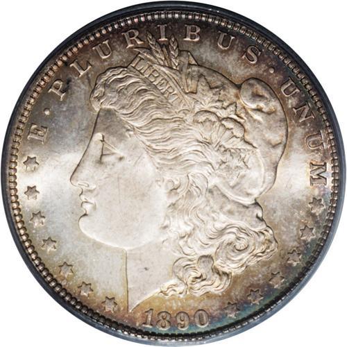 <B>1890-CC<img border='0' src='http://www.heritagecoins.com/images/star.gif' width=10 height=10>$1> MS65 PCGS.</B></I> Ex: Eliasberg. This example is from the famous Eliasberg Collection, and has witnessed only a few owners since the day it was made, now with a continuous pedigree back to 1894! Seldom in today's numismatic arena does such a situation occur. This coin was described in the Eliasberg catalog as: "Intense light golden and iridescent toning over lustrous and somewhat prooflike surfaces. Very pleasing to the eye. While the 1890-CC is not rare in an absolute sense, pieces of this visual quality can be termed elusive." The Eliasberg description remains accurate today, meaning there has been no attempt to adjust its appearance. Only eight finer examples of this date have been certified by PCGS (1/06).<BR><I>Ex: J. Colvin Randall (3/1894); J.M. Clapp; John H. Clapp; Louis E. Eliasberg, Sr. (Bowers and Merena, 4/1997), lot 2283.</B></I><BR><I>From The Michael Casper Collection, Part Three.</B></I>