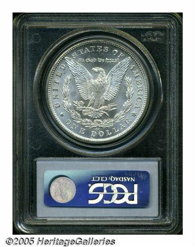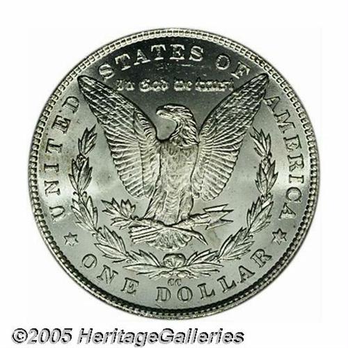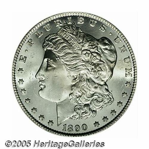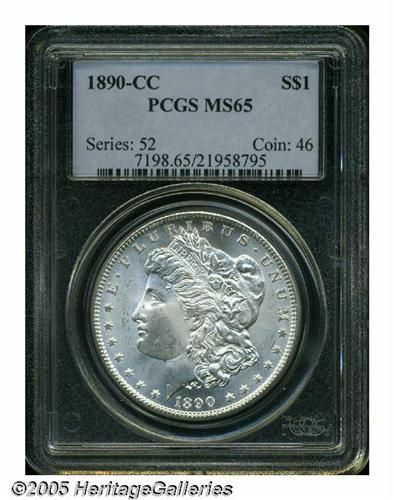 <B>1890-CC<S$1> MS65 PCGS.</B></I> Wisps of tan color endow this lustrous and meticulously struck Gem. The fields are beautifully preserved, and the face has only light contact. Among the scarcer Carson City issues, although overshadowed by the key 1889-CC. As of (5/05), the combined forces of PCGS and NGC have certified only 10 pieces above the MS65 level.