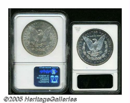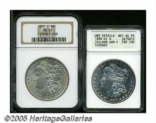 <B>1890-CC<S$1> Tail Bar--Cleaned--ANACS. Unc Details, Net AU55,</B></I> VAM-4, Top 100 Variety, a wide die line caused by a gouge in the working die connects the wreath to the intersection of the fletchings and tail feathers on this lightly hairlined, excessively bright '90-CC; and an <B>1897-O MS61 NGC,</B></I> lightly toned surfaces display some wispy slidemarks.