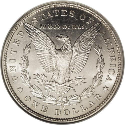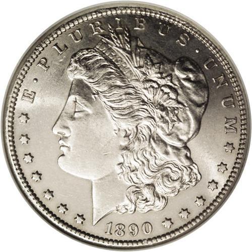 <B>1890-CC<img border='0' src='http://www.heritagecoins.com/images/star.gif' width=10 height=10>$1> Tail Bar MS62 NGC.</B></I> VAM-4. Top 100 Variety. A wide die line caused by a gouge in the working die connects the wreath to the intersection of the fletchings and tail feathers. This essentially untoned example possesses subdued luster, this being the primary grade-limiting factor. There are no mentionable marks on either side.