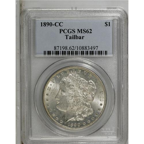 <B>1890-CC S$1 Tail Bar MS62 PCGS.</B></I> VAM-4. A Top 100 Variety. The short but broad die scratch from the tail to the wreath makes this popular variety among the most distinctive and widely known. A crisply struck piece with original medium tan-gray toning and unbroken cartwheel sheen. Minor luster grazes on the cheek limit the grade but not the eye appeal.<BR><BR><b>Shipping:</b> Coin/Currency (<a target="_blank" href="http://www.heritageauctions.com/common/shipping.php">view shipping information</a>)