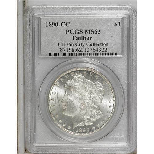<B>1890-CC S$1 Tail Bar MS62 PCGS.</B></I> VAM-4. A Top 100 Variety. Ex: Carson City Collection. Created by a prominent scratch in the die that extends from the arrow feather to the olive leaves below. Most, perhaps all, Tail Bar dollars are sharply struck, as this piece is. The surfaces are brilliant and there are a few noticeable, grade-limiting abrasions, most especially a couple of shallow luster grazes in the left obverse field.<BR><BR><b>Shipping:</b> Coins & Currency (<a target="_blank" href="http://www.heritageauctions.com/common/shipping.php">view shipping information</a>)