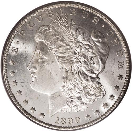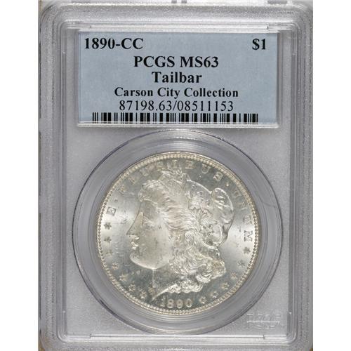 <B>1890-CC S$1 Tail Bar MS63 PCGS.</B></I> Ex: Carson City Collection. VAM-4. A Top 100 Variety. The "Tail Bar" is a VAM easily identified with the unaided eye. This has contributed greatly to its increased popularity over the past ten years, although the <I>Guide Book</B></I> remains too proud to list it. This lustrous Select example has light gold toning and a sharp strike. Minor grazes on the portrait prevent a finer grade.<BR><BR><b>Shipping:</b> Coins & Currency (<a target="_blank" href="http://www.heritageauctions.com/common/shipping.php">view shipping information</a>)