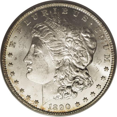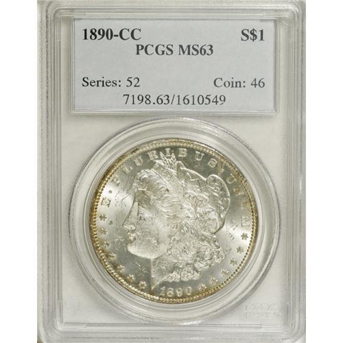 <B>1890-CC S$1 Tail Bar MS63 PCGS.</B></I> VAM-4. A Top 100 Variety. Among the most popular Carson City VAMs due to the broad die scratch beneath the left border of the tail feathers. Honey-tinged borders enliven this lustrous and flashy silver dollar. Nicely struck, and the faint marks are generally confined to Liberty's cheek and neck.<BR><BR><b>Shipping:</b> Coins & Currency (<a target="_blank" href="http://www.heritageauctions.com/common/shipping.php">view shipping information</a>)