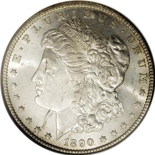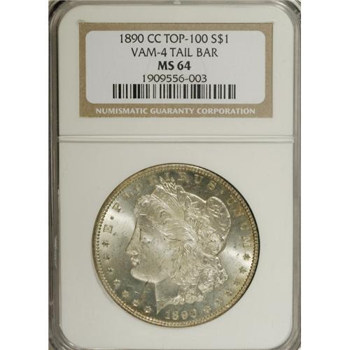 <B>1890-CC S$1 Tail Bar MS64 NGC.</B></I> VAM-4. A Top-100 Variety. The Tail Bar variety gets its name from a heavy die line that extends down from the extreme left side of the eagle's tail. There was a time that this variety was given little attention in numismatic circles, but today it is one of the most popular of all Morgan dollar varieties. This example is a pleasing and lustrous near-Gem with attractive peripheral iridescence on the reverse.<BR><BR><b>Shipping:</b> Coins & Currency (<a target="_blank" href="http://www.heritageauctions.com/common/shipping.php">view shipping information</a>)