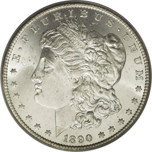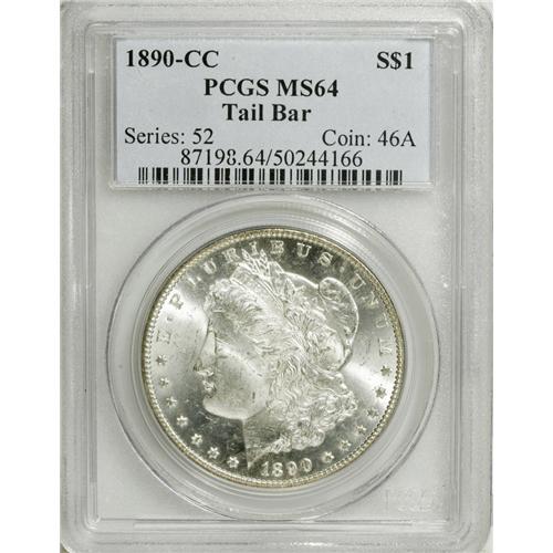 <B>1890-CC S$1 Tail Bar MS64 PCGS.</B></I> VAM-4. A Top 100 Variety. The Tail Bar variety is the most popular and easily recognizable variety of the 1890-CC Morgan dollar. Less than 4,000 1890-CC dollars remained in the Treasury after 1964, and those were sold with the GSA offerings of the 1970s, making the population figures for this variety problematic. This example is fully brilliant with flashy silver-white surfaces on both sides. The fields are semi-reflective, with mild cameo contrast evident. A few scattered, grade-limiting abrasions are evident on obverse and reverse alike. Population: 57 in 64, 1 finer (2/07).<BR><I>From The Jackson Hole Collection.</B></I><BR><BR><b>Shipping:</b> Coins & Currency (<a target="_blank" href="http://www.heritageauctions.com/common/shipping.php">view shipping information</a>)