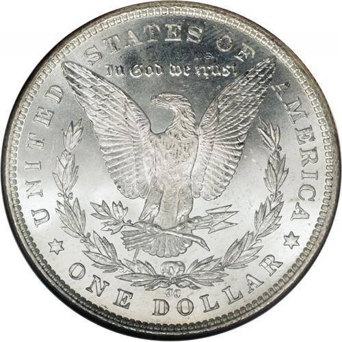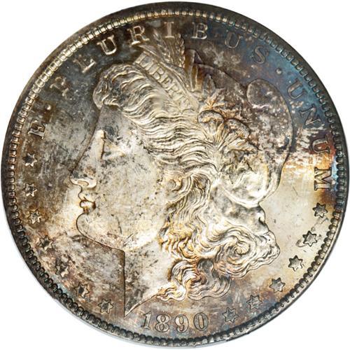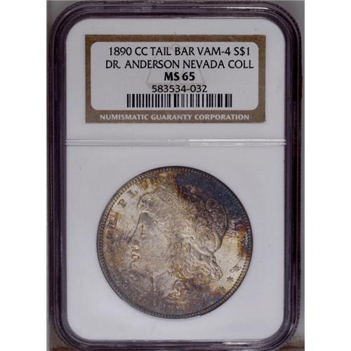 <B>1890-CC<img border='0' src='http://www.heritagecoins.com/images/star.gif' width=10 height=10>$1> Tail Bar MS65 NGC.</B></I> VAM-4. A Top 100 Variety. Ex: Dr. Anderson Nevada Collection. The rare "Tail Bar" variety derives its nickname from a heavy die gouge below the arrow feathers which extends to the wreath below. While the reverse is fully brilliant, the obverse offers rich swaths of russet-gold near the rims, with a prominent splash of aqua above Liberty's head. A nicely struck Gem with impressive surfaces and eye appeal to match. This is the Finest and only Gem certified example of this popular variety, and certainly appears to be the Finest Known survivor of this issue. Therefore, this coin is of paramount importance to the specialist, and certainly worthy of the finest Morgan dollar collection. Census: 1 in 65, 0 finer (3/06). <BR><BR><B>Important notice:</B> Heritage usually auctions material at the rate of 200-250 lots per hour. On some occasions eBay Live bid software or the Internet may not be able to keep up with the pace of the auction. We recommend placing a realistic absentee bid now as insurance to avoid disappointment. Occasionally the auctioneer may eliminate or reject an eBay Live bid, and the auctioneer may also reopen a lot after the close of the eBay live bidding (usually because we missed an audience bid), and may reject your bid even if it shows you as the winning bidder. By bidding via eBay Live, you agree that Heritage may award the lot to another bidder at its sole discretion under the circumstances described above or any other reasonable circumstances. Since eBay bids are not shown to us until we open the lot on the floor, we treat those bids just like floor bids. In most cases the floor responds before the eBay bid is presented to us, due to Internet lag time, so for consistency we have made it a policy that floor bids are always considered first over tie eBay live bids. Also please note that all Heritage lots purchased through eBay Live carry a 20% Buyer's Premium. Please make sure you read the Terms and Conditions before you bid. This lot is being auctioned in conjunction with a live floor auction by Heritage Galleries & Auctioneers. All final auction and invoice information will be supplied by Heritage Galleries & Auctioneers, and all other information should be considered preliminary. Lot:3534 <BR><BR><B>Winning Notification and Billing:</B> After the FINAL session in this auction is complete, Heritage will send e-mail and snail mail invoices. This process normally takes several days. All final auction and invoice information will be supplied by Heritage Galleries & Auctioneers, and all other information should be considered preliminary. <BR><BR>This auction will be conducted on a live auction floor and over the Internet through eBay Live. If you choose to place an absentee bid, please take a moment to <font color='#0000ff'><u><a href='http://pages.ebay.com/liveauctions/help/before/laabsentee.html'>learn how eBay Live absentee bidding works</a></u></font><font color='#000000'>
