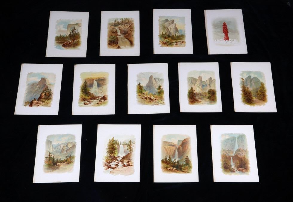 For your consideration is this collection of thirteen Yosemite, Illustrated in colors, and was published by H.S. Crocker and Co. in 1890, the year Yosemite became a national park. Illustrations in the collection include illustrations by H.W. Hansen and Carll Dahlgren. The condition of these chromolithographs is good showing well preserved chromolithographs and good overall condition of the plates in general. The measurements of these chromolithographs are 13 1/2" x 10 1/4".