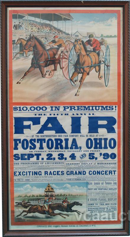 1890 Fostoria OHIO "Fair" Colored Broadside, Russell Morgan Printing Co. Cincinnati, OHIO Printers (some repairs) framed - 19" x 35"