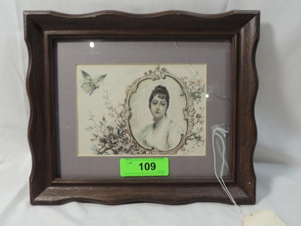 1890 GERMAN FRAMED AND MATTED FRAMED DRAWING GIRL WITH BUTTERFLY.CRACK IN GLASS AS SHOWN. SEE PHOTO FOR MORE DETAILS