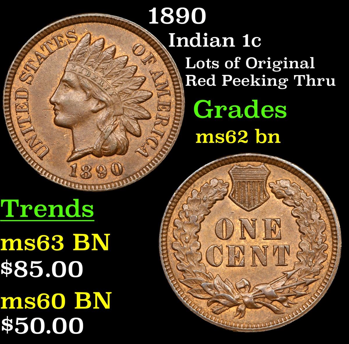 1890 Indian Cent 1c Grades Select Unc BN.