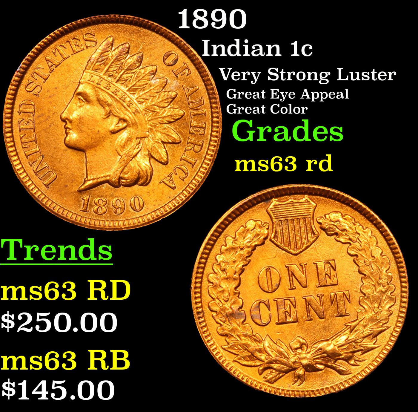 1890 Indian Cent 1c Grades Select Unc RD.