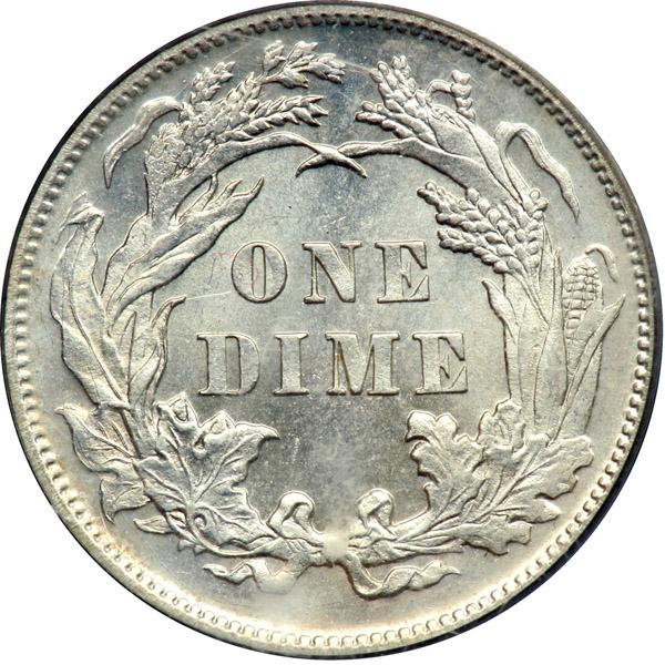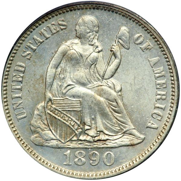 1890 Liberty Seated Dime. PCGS graded MS-65. Frosty and white with reflective surfaces. Pop 55; 38 in 66, 3 in 67 (PCGS # 4704) .