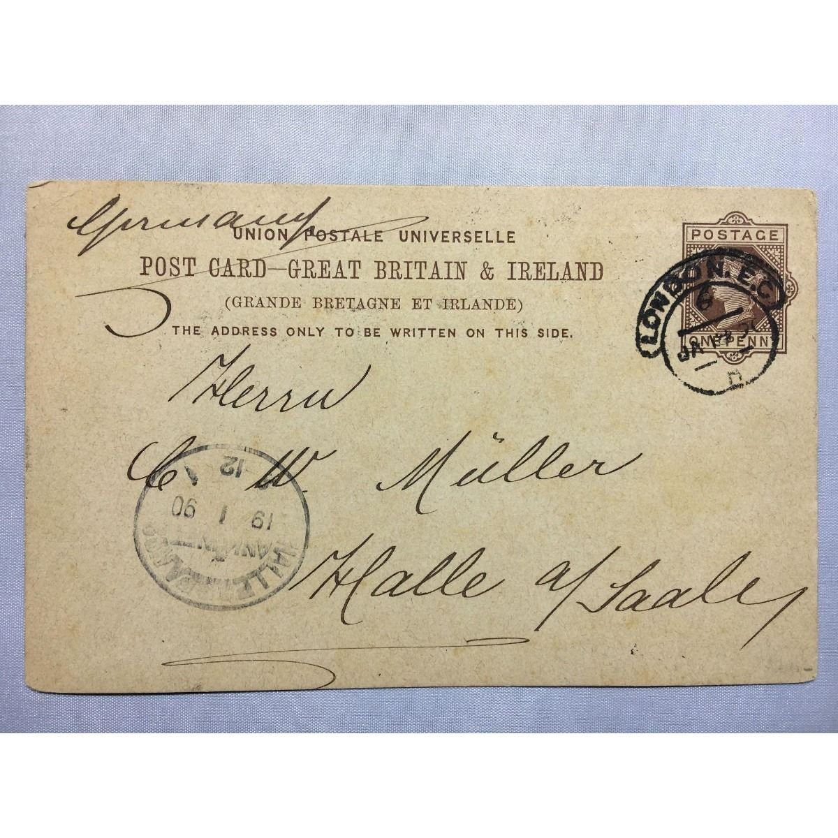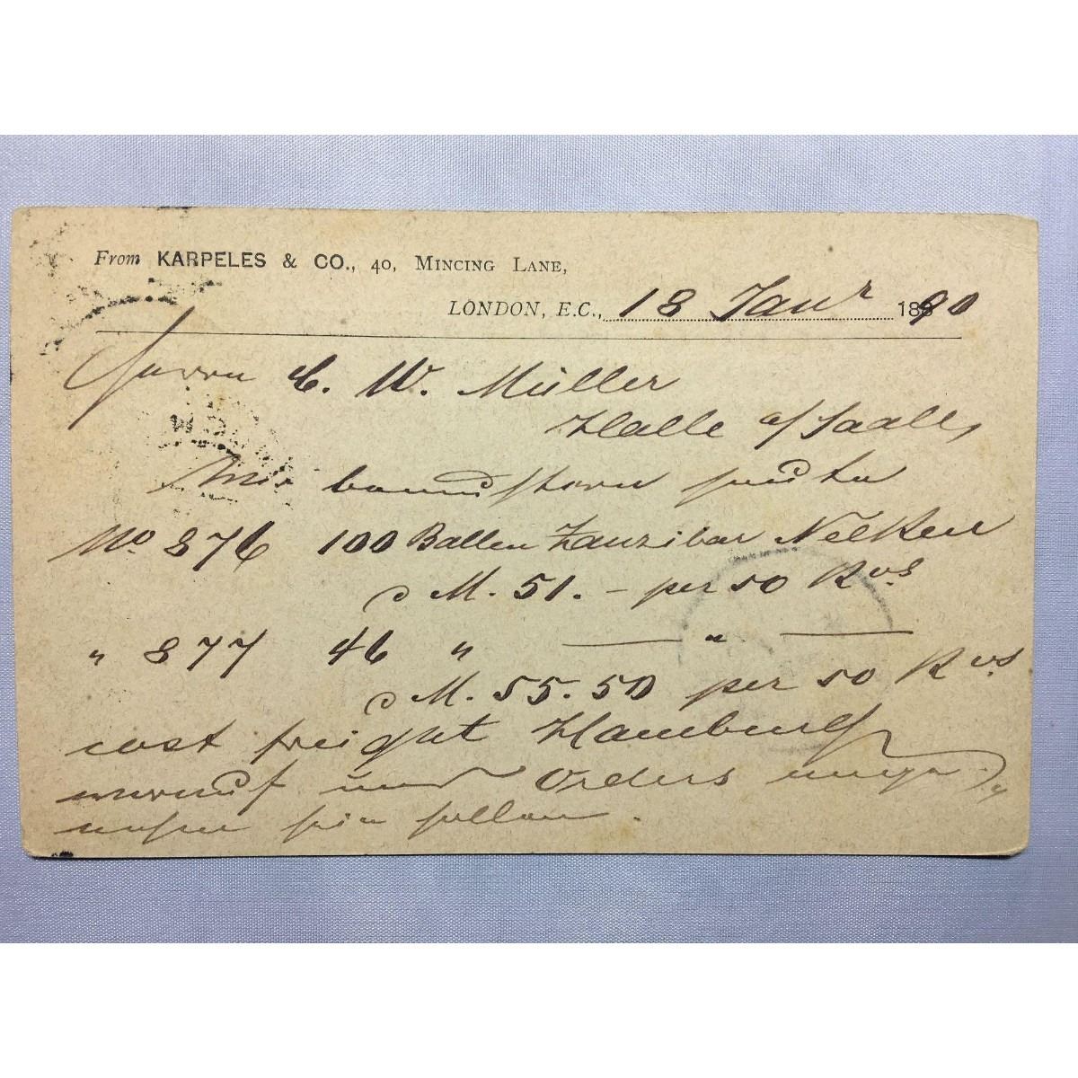 1890 London stamped original iron gall handwritten post card now in a protective sleeve with a British pennystamp. This handwritten postcard from Karpeles & Co was sent to Mr G. W. Miller.