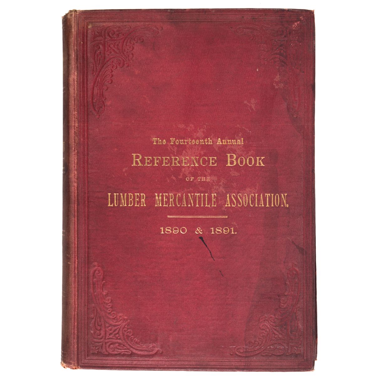Clancy, William, Manager (Published by). The Reference Book of the Lumber Mercantile Association, July 1890. This is the fourteenth annual edition. Lists all lumber mercantiles alphabetically by state. Includes whether or not the operation also had a saw mill, planing mills, or other large equipment. Also lists any and all specialties such as agricultural implements, general store, hardwood lumber, sash, doors and blinds, and shingles. Reference key at front lists 109 different reporting codes for company status such as "pay and credit not established," "failed recently," "burned out," and "keep no yard," etc. This directory covers a significant era of milling and lumber operations throughout the United States. Printed in single column. With slight damage at spine at inside front cover. 574 pp. Hardbound in decoratively embossed red cloth with gilt lettering. 7" x 10". - Vinegar Collection