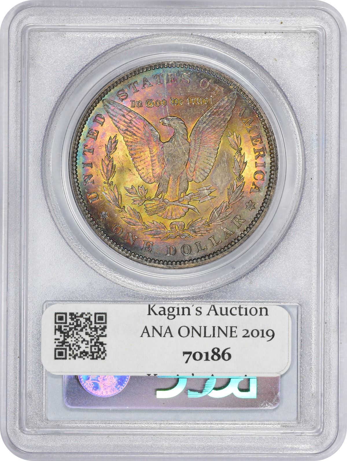Spectacular rainbow iridescence engages both sides of this satiny near-gem Morgan. A visual treat! PCGS #7196