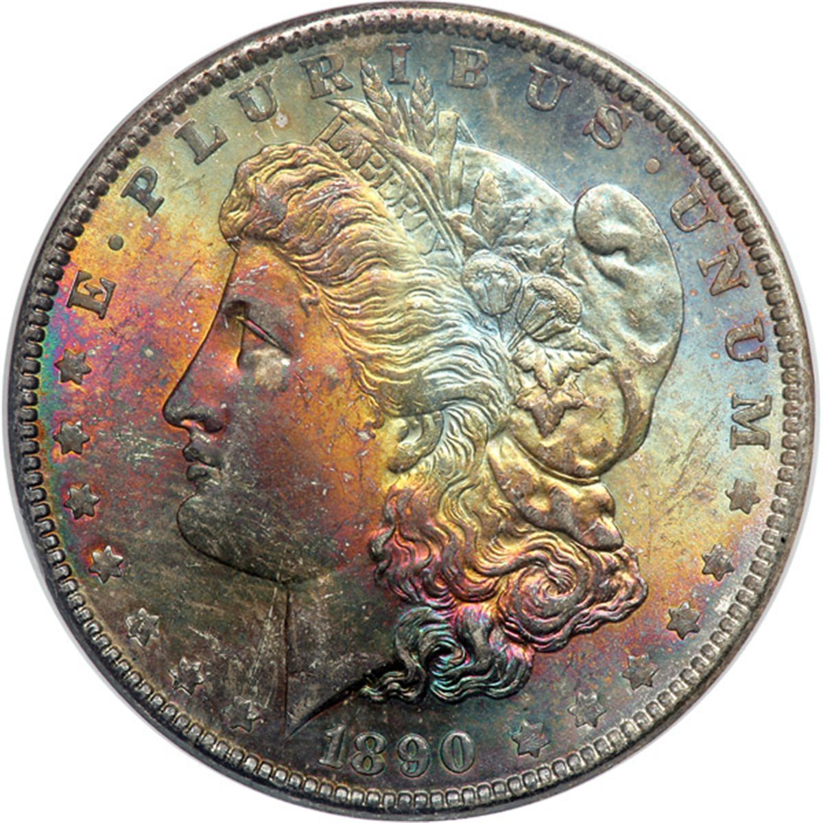 1890 Morgan Dollar. NGC graded MS-65. The obverse displays lovely rainbow toning. The underpinning silvery luster on both sides is full with a strong and beautiful satin texture. This is a decidedly well-struck example with commanding details, unlike most in the 1890 to 1897 period. It has no bothersome abrasions or points of wear, which increases the coin’s prestige, nor did the dies leave behind a less than rigid impression of softness in the centers. The centers are fully defined. Everything sharp. Pop 271; 6 finer (PCGS # 7196) .